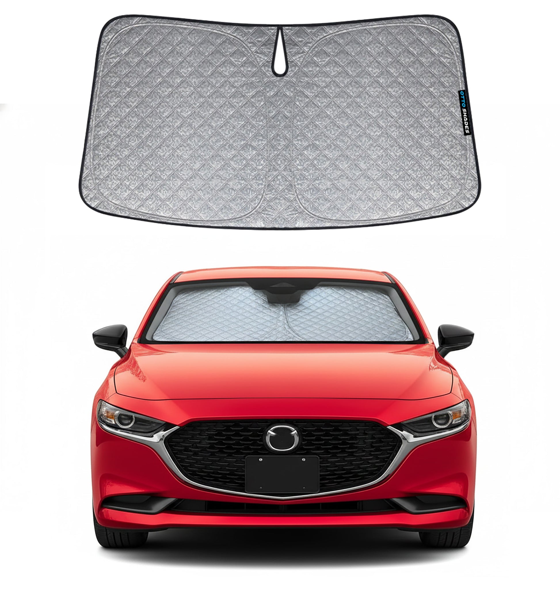 - Custom Design for a Perfect Fit: Specifically designed Sun shade for Mazda 3 (2019-2025), offers a precise fit with reinforced steel rings that secure it in place without the need for suction cups. It will not sag or collapse, providing full coverage and reliable protection.